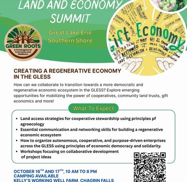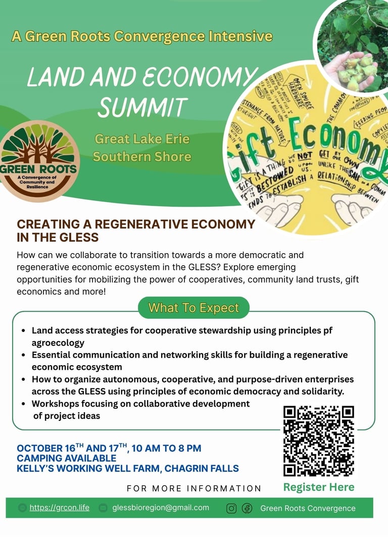 As part of the convergence, local permaculturists James (Jas) Matalik of Bending Oak Educational Farm, Sarah Akovic of Lorain County Community College Sustainable Agriculture, and John Wright of Red Beet Row will be offering a 2 day Permaculture in the GLESS Intensive Program. Please consider joining them October 16 & 17, 2025, for this dynamic, hands-on experience designed to immerse you in the principles and practices of permaculture while equipping you with practical skills to create sustainable and resilient systems in our bioregion. This workshop is perfect for beginners and enthusiasts alike, offering a blend of theory, design, practical exercises, and community connection to inspire regenerative living. The program will take place at Kelly’s Working Well Farm in Chagrin Falls. Meals provided/camping available.